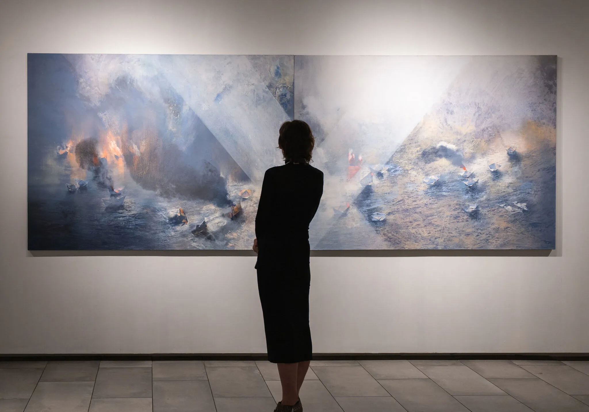Zoya Frolova’s paintings respond to life’s most devastating events with artistic vision. Through the power of metaphor, paper boats replace warships and childhood innocence confronts naval might. When fire, paper, and water converge, they reveal both the fragility of human existence and the profound absurdity of our current moment.